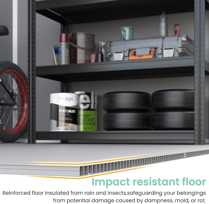 - MULTI-FUNCTIONAL & ECO-CONSCIOUS: Configure as workshop (add pegboards for tools), RV gear depot (holds 6 kayak paddles + 4 life jackets), or landscaping HQ (shelves support 40lb bags). Eco-friendly resin 100% recyclable after 5+ years use