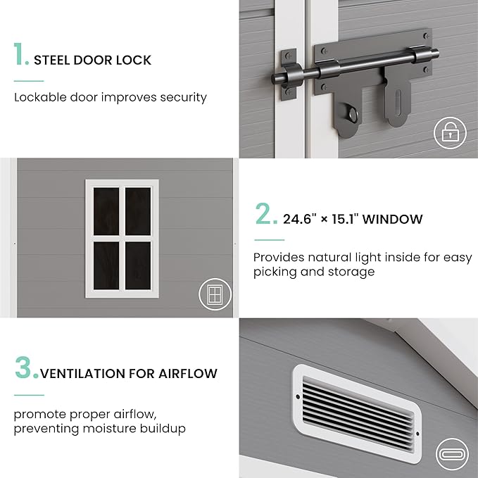 - WEATHERPROOF SECURITY & VENTILATION: Lockable door with moisture-resistant seals deters pests and accidental openings. The 24.6"x15.1" window provides airflow and lets you check tools at a glance, even in rainy weather