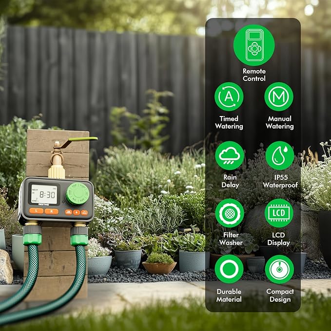 - 【Built for Outdoor Use】Designed with IP55 waterproof protection and leakproof construction, this timer is perfect for various outdoor watering applications, including garden hose irrigation, lawn sprinklers, greenhouse misting, pool filling, birdbaths, rain barrels, and even pet water dispense