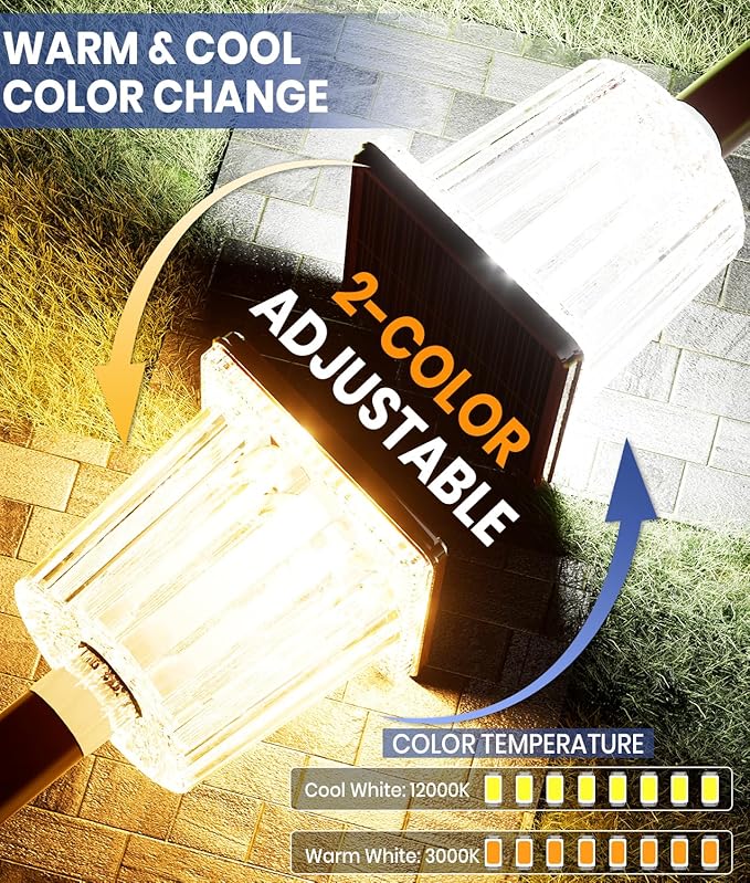 - 🌓 Dual-Tone Landscape Lighting System ▷§▁ Easily toggle the button on the back edge of the solar panel powered, change between adjustable warm white (fall/winter coziness❄️) and cool white (spring/summer vibes🌼). Adapt seasonally solar outdoor garden decor and create a holiday atmosphere moods outside lights for house.