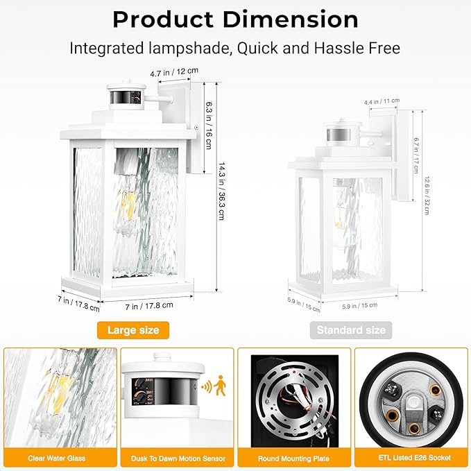 - [ Quick Installation & Universal E26 Socket ] With a user-friendly design featuring an opening bottom, changing bulbs is effortless and doesn’t require any tools. Plus, our bulb socket fits any bulb with a standard E26 socket, making it versatile and easy to use. Please note that to avoid any flicker issues, we recommend using DIMMABLE LED bulbs or incandescent bulbs with our outdoor wall lights exterior. (Bulbs not included)