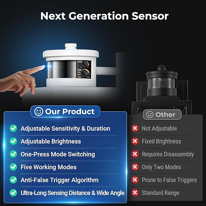 - [3 Adjustment Parameters] Adjust as you wish to find the lighting that suits you best. ① Brightness Adjustment: Adjust the brightness in Dim Mode to within a range of 15%-50%, or in ECO / D2D / ON modes to a range of 15% -100%. ② Sensitivity Adjustment: Set the sensor's detection range between 10 and 40 feet according to your requirements. ③ Lighting Holding Time Adjustment: Adjust the light holding time from 20 seconds to 5 minutes in the DIM, ECO, and D2D mode.