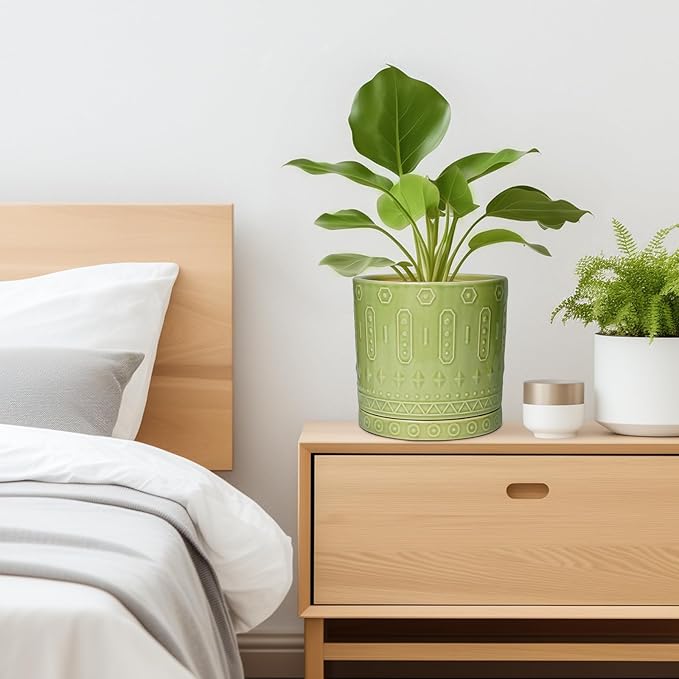 8 Inch Plant Pots - Ceramic Planter for Indoor Plants Outdoor, Round Ceramic Flower Pots with Drainage Hole and Saucer, Boho Decorative Planter, Home Bedroom Decor, Birthday Gifts, Green