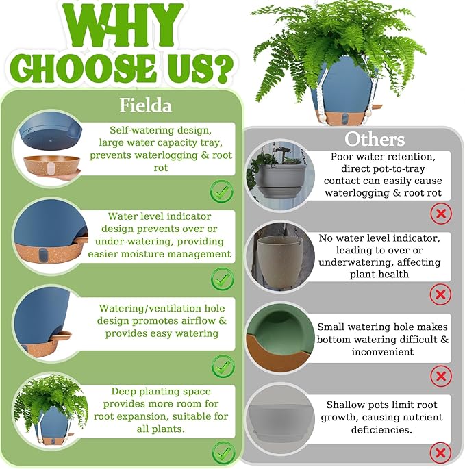 - 【Never Over/Underwater Again!】Fielda's indoor hanging planters feature an EXCLUSIVE WATER WINDOW in the base tray - instantly check moisture levels without guesswork! Protect your plants from dehydration and promote healthy root systems with this visual watering guide. Perfect for hanging pots for indoor plants enthusiasts who value scientific plant care.