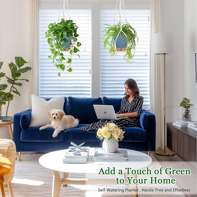- 【Smart Self-Watering System】 Our hanging plant pots come with a REMOVABLE RESERVOIR TRAY that stores 7-10 day water supply. Absorbent cotton ropes automatically deliver moisture to soil when needed - ideal for vacations or busy lifestyles. Spend less time watering hanging baskets for indoor plants!