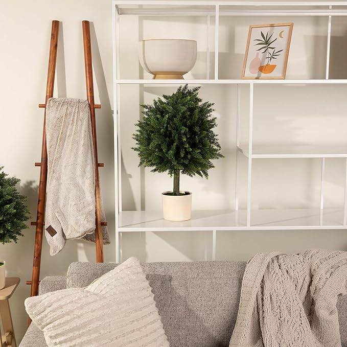 - INSTANT CURB APPEAL – Our lifelike cypress adds a fresh, welcoming touch to your entryway or patio. Each topiary measures about 16" across at its widest point for a full, lush look.