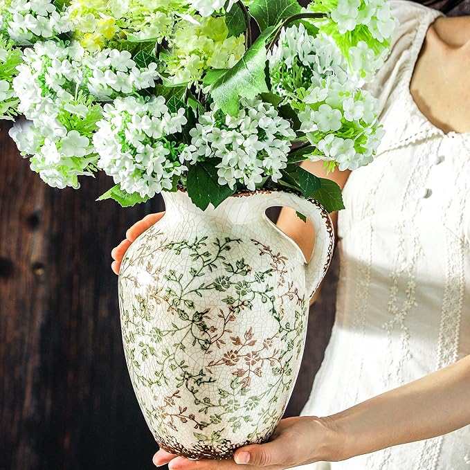 Enra Vintage vase,Ceramic Chinoiserie Floral Vase,Green and Beige Decorative Flower vase,Large Rustic Vases for Home Decors, Living Room, Bookshelf, Office,9.7 inch