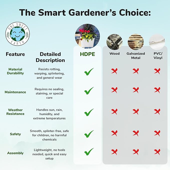 - DURABLE & WEATHER-RESISTANT DESIGN: Constructed from heavy-duty HDPE plastic, this raised garden bed resists warping, cracking, and rotting, offering season-long durability. No rusting, no splinters, and no painting—just dependable outdoor gardening season after season.