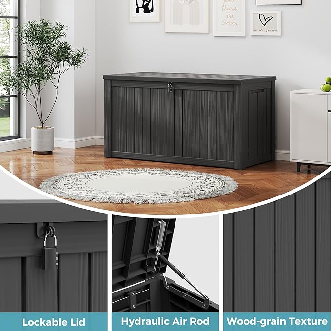- Deck Boxes Outdoor Waterproof: Designed as a waterproof storage solution, this deck box protects your belongings from moisture and ensures they stay dry even during heavy rain. The lockable lid adds an extra layer of security, keeping your valuables safe from theft or damage.