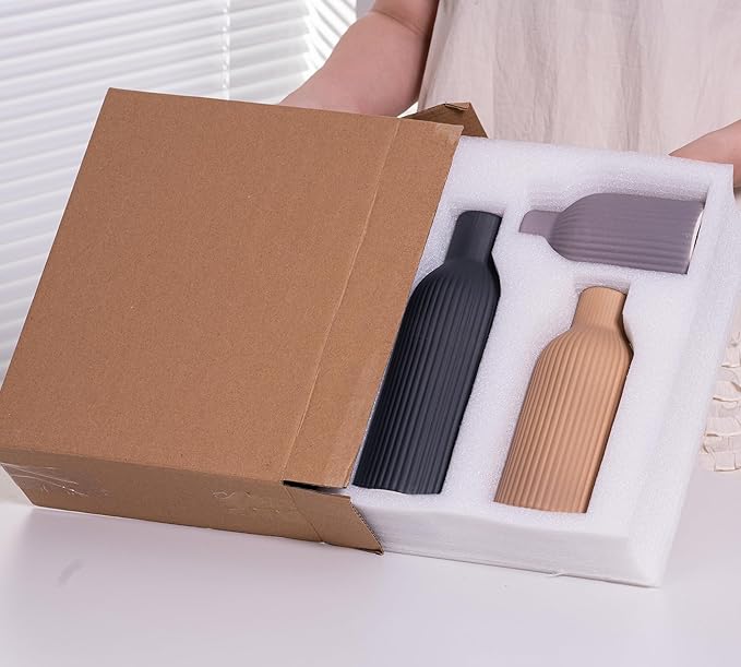 - Unique Ribbed Design : Featuring a distinctive ribbed texture and a warm brown finish,these vases bring a modern yet timeless aesthetic to your home.The vertical grooves create a visually striking pattern , making them ideal for farmhouse , pampas grass decor styles.๏ผLength x Diameter=9.96 x 3.35", 7.87 x 3.31",5.79 x 3.31",the dimensions are all measured by hand , So there may be some small deviations.)