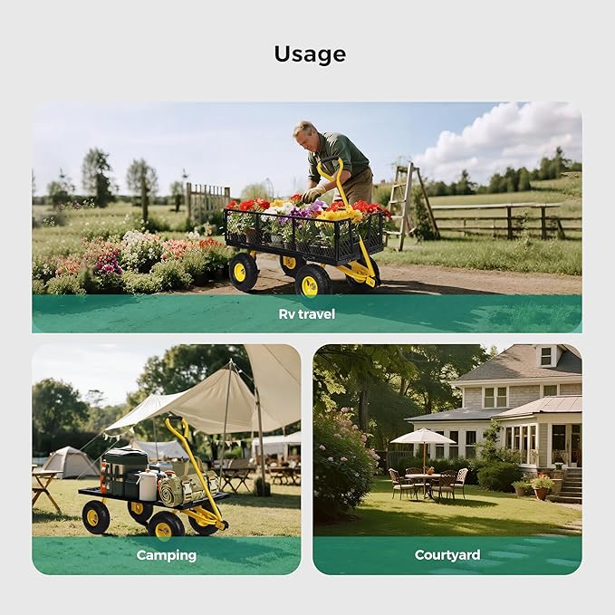 - 【All-Terrain 10-Inch Pneumatic Wheels】The large garden cart, air-filled rubber tires provide superior stability and traction on uneven, muddy, or gravelly surfaces. Effortlessly navigate through various terrains while carrying heavy loads.PLEASE BE AWARE that the tires are not fully inflated due to safe transport consideration.