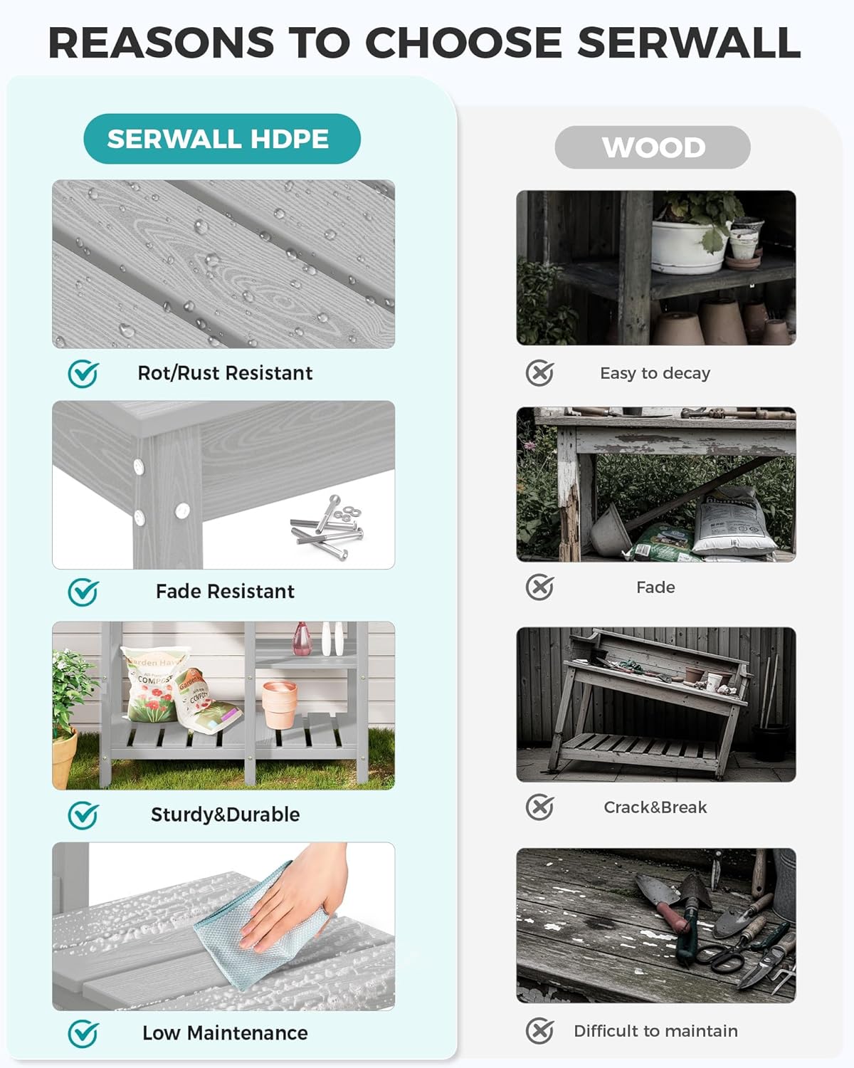 - HDPE Material: Constructed from 100% HDPE material, the SERWALL outdoor potting bench offers high strength and stability, ensuring a long service life. Potting bench table is durable for outdoor use in any weather condition.