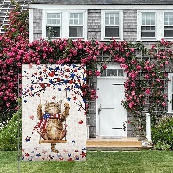 - Unique Design - This garden flag feature cute cat to swing,heart USA flag and star pattern, that full of festival atmosphere, and expressing the good blessing and best wishes