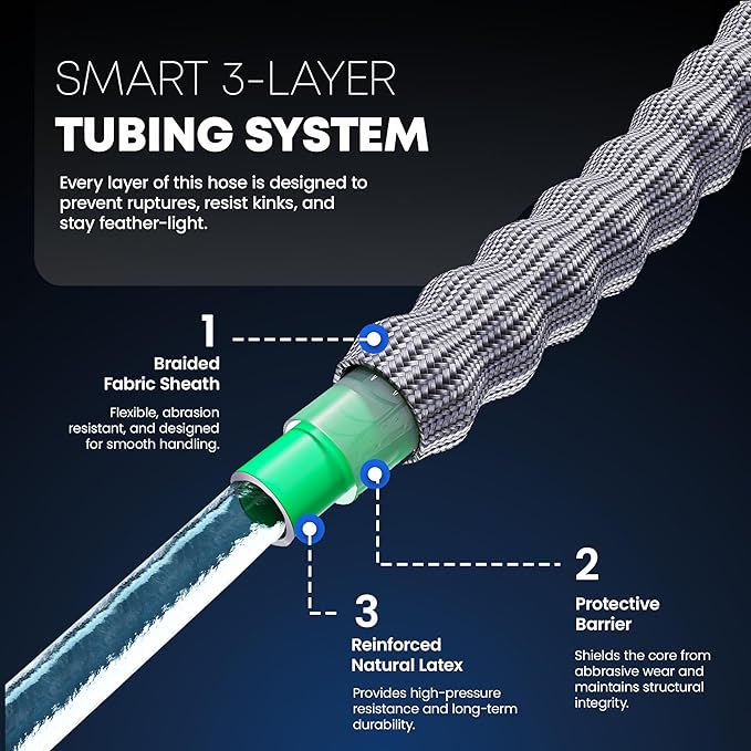 - [Universally Compatible Kink-Free Design] Engineered with standard 3/4" GHT, corrosion free, pure brass connectors, our hose fits a wide array of faucets nozzles and accessories. The ultra flexible, never kinking design contributes to a hassle-free watering experience. The triple layer construction provides a durable and manageable garden hose with dependable performance in various weather conditions.