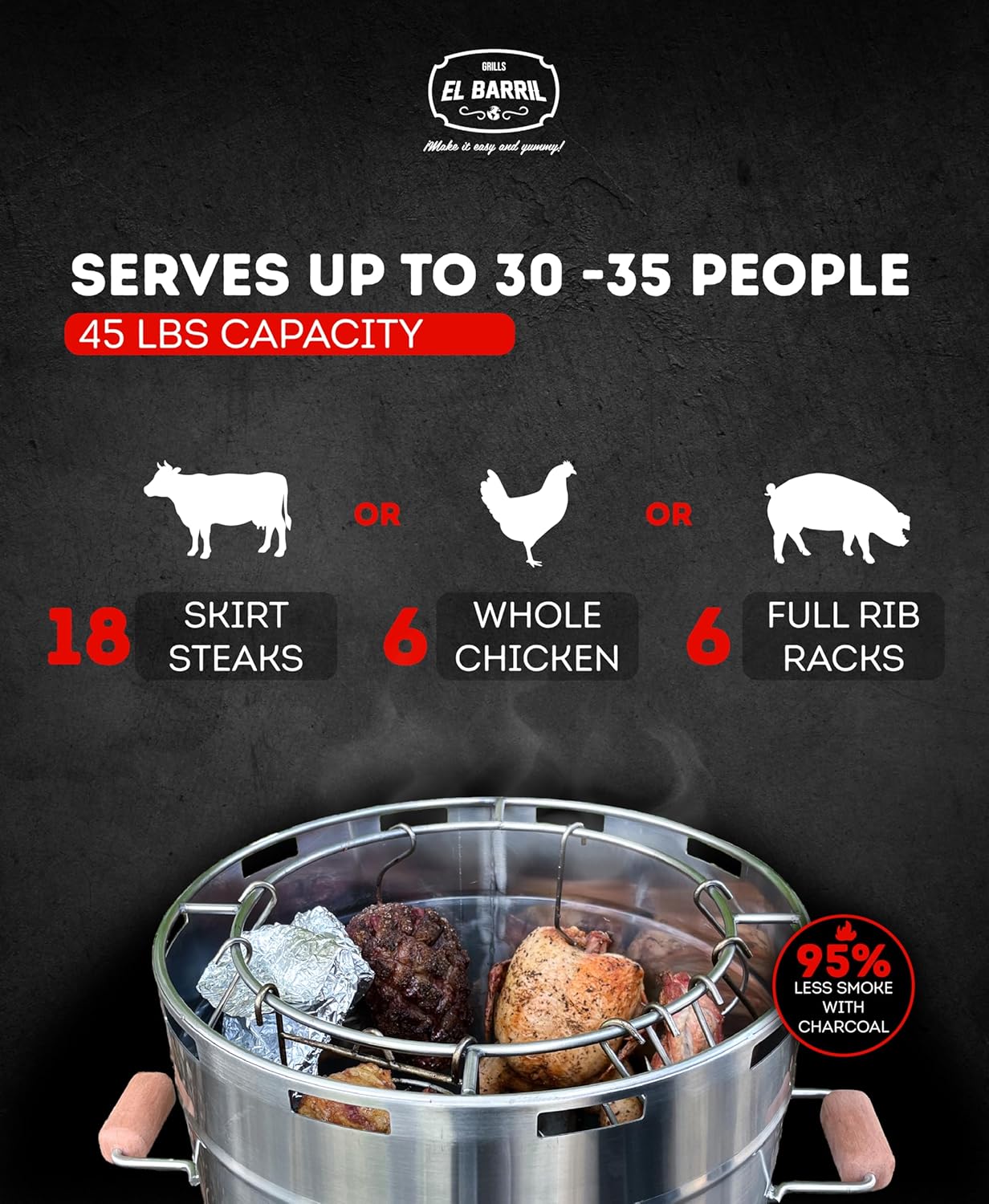 - HUGE 45 LBS MEAT CAPACITY, PERFECT FOR BIG GATHERINGS AND EVENTS: Whether you're hosting family reunions, neighborhood cookouts, or BBQ competitions, the El Barril Lite Large gives you the space and power to smoke, grill, and cook up to 45 lbs of delicious meats.