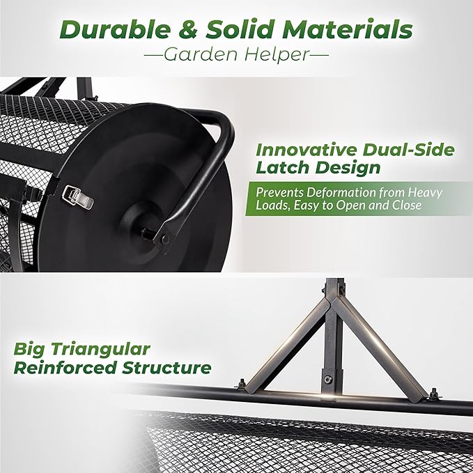 - RUST-RESISTANT STEEL STRUCTURE: Built with all-steel materials and a powder-coated finish for long-lasting durability. With non-slip rubber handle grips for added comfort and control during transport.The peat moss spreader break up the clumpy materials while tumbling, ensuring an even flow and spread of product on the lawn or garden. This soil lawn spreader equably distributes compost, manure, dirt, peat moss, and other topdressing materials to plant, feed, and weed your lawn and garden.