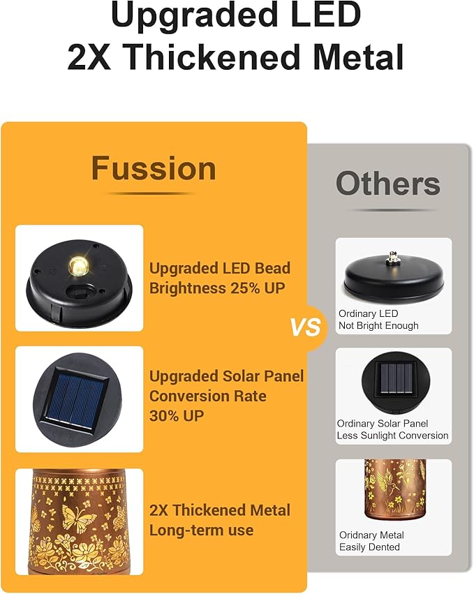 - 【Enhanced Brightness & 2X Thickened Metal】- Enjoy brighter and more vivid illumination with upgraded LED bead that provide 25% more brightness than traditional models. The delicate hollow out metal veneer ensures the Butterfly pattern is displayed with stunning clarity. Made from 2X thickened metal, these solar lanterns for porch are built to last, offering exceptional durability and resistance to bending or denting. Additionally, the solar panel power efficiency has been improved by 30%, improve energy conversion for longer lighting time.