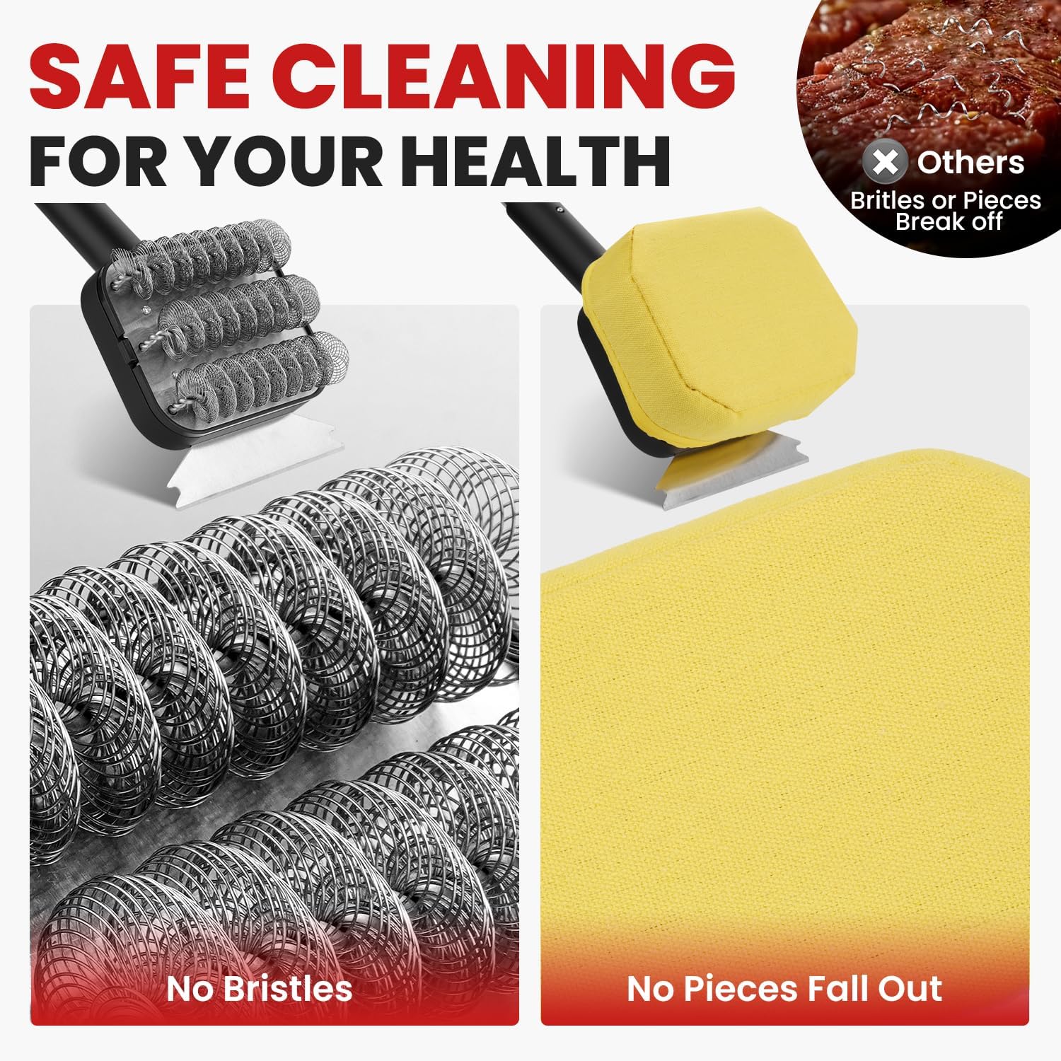 - Extended & Durable Handle: Coinicxcel grill cleaning brush built with high-quality stainless steel and ABS plastic, this bristle free grill brush features an ultra-sturdy handle that resists bending, breaking, or rusting—unlike flimsy competitors. The 19-inch extended length keeps your hands safely away from heat and grease splatter, while the ergonomic non-slip grip ensures total control, even with wet or greasy hands. Equipped with hooks for convenient hanging.