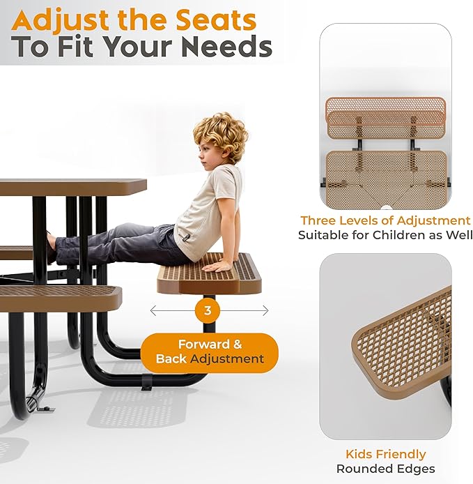 Metal Picnic Tables for Outdoors with Umbrella Hole - Coated Steel Heavy Duty Commercial Grade Table with Adjustable Seats (Brown, 46 in, Square, Expanded Steel)