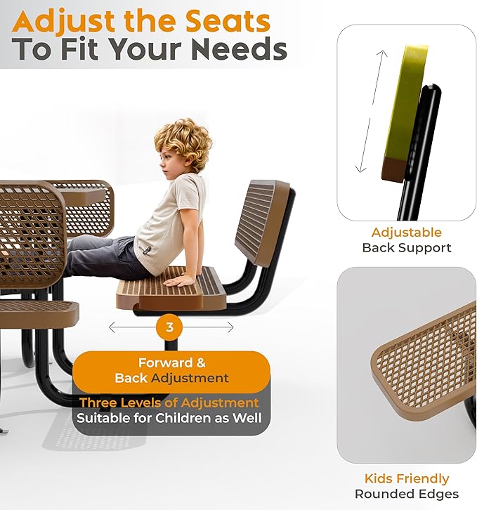 Metal Picnic Tables for Outdoors with Umbrella Hole - Coated Steel Heavy Duty Commercial Grade Table with Adjustable Seats (Brown, 46 in, Square with Back, Expanded Steel)