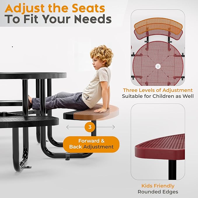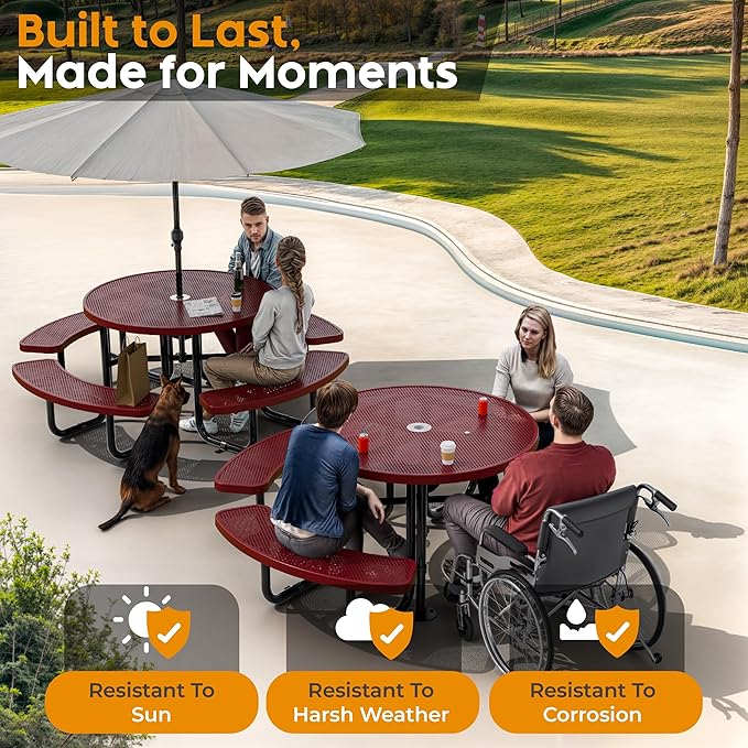 - Designed for Decades of Outdoor Use: Round outdoor picnic table crafted from industrial-strength steel and thick coated in thermoplastic for rust-free, long-lasting quality. Sturdy steel frame with powder-coat finish resists harsh weather, making it the definition of a weather proof table.