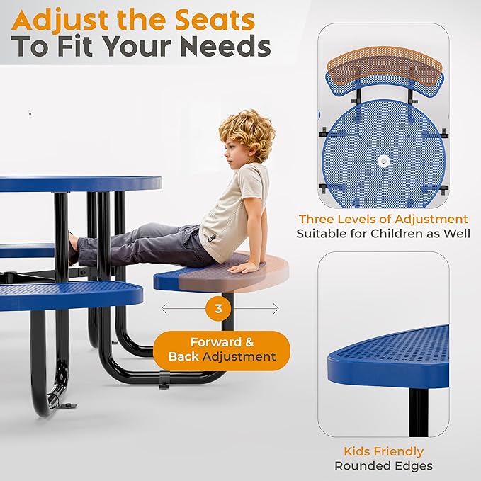Metal Picnic Tables for Outdoors with Umbrella Hole - Coated Steel Heavy Duty Commercial Grade Table with Adjustable Seats (Blue, 46 in, Round, Punched Steel)