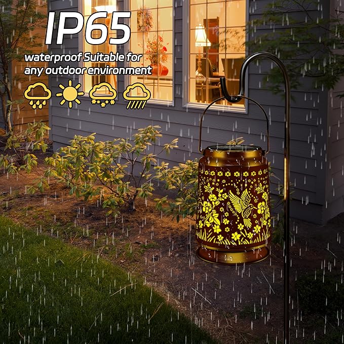 - Durable and Waterproof Outdoor Solar Lantens Lights:The solar outdoor hangings hummingbird lanterns decorative is made of metal which is sturdy and durable.IP65 waterproof rating design, don't worry about rain,solar garden lights can work on rainy days,Solar power supply, no electricity charge, no power cord required, easy to use.