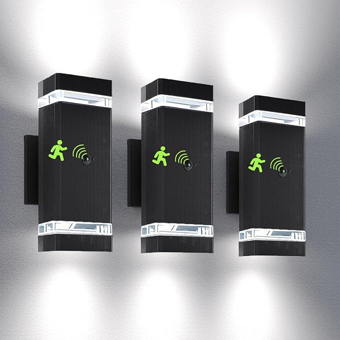 - 1. π Smart Motion Sensor + Dusk to Dawn: Equipped with an upgraded PIR motion sensor and IC photocell, these motion sensor outdoor wall lights automatically turn on at dusk and off at dawn. the wall lights brighten to 100% when PIR motion sensor detects movement at night, adding extra visibility and security to your front door, garage, or patio.