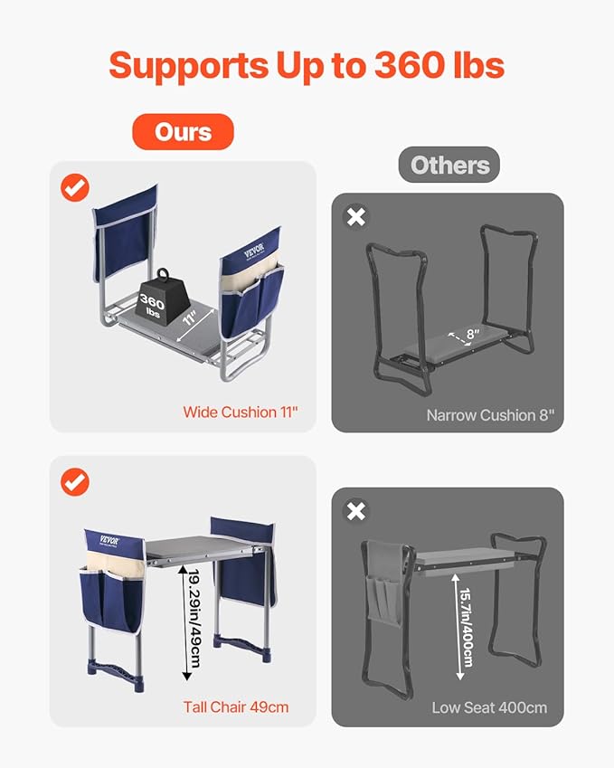 - Supports Up to 360 lbs: Built with high-strength A3 steel and a powder-coated finish, this garden kneeling stool ensures stability and durability. It supports up to 330 lbs, making it ideal for gardening, household chores, and any activity requiring strong support.