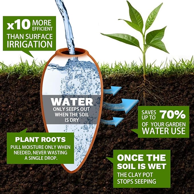 - Ideal for Consistent, Hands-off Plant Hydration: simply bury the terracotta watering pots in soil near roots, fill with water, and let the porous terracotta slowly release moisture as plants need it. Perfect for gardens, potted plants, and vacation care.