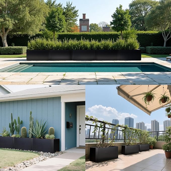 - 【Material And Size】: Black Rectangular Planter size 36''L x 15''W x 15''H, made of high quality galvanized steel, strong and durable, anti-deformation and corrosion resistance, long service life.