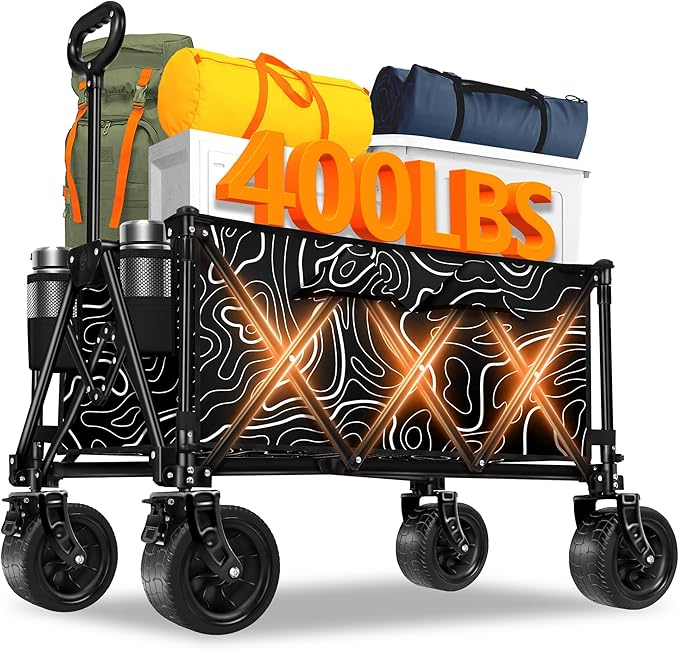 Collapsible Wagon with Big Wheels, Wagons Carts Foldable 400LBS Large Capacity, Heavy Duty Utility Cart Grocery Wagon w/Side Pockets and Brakes, All-Terrain Beach Cart for Camping, Sports, Shopping