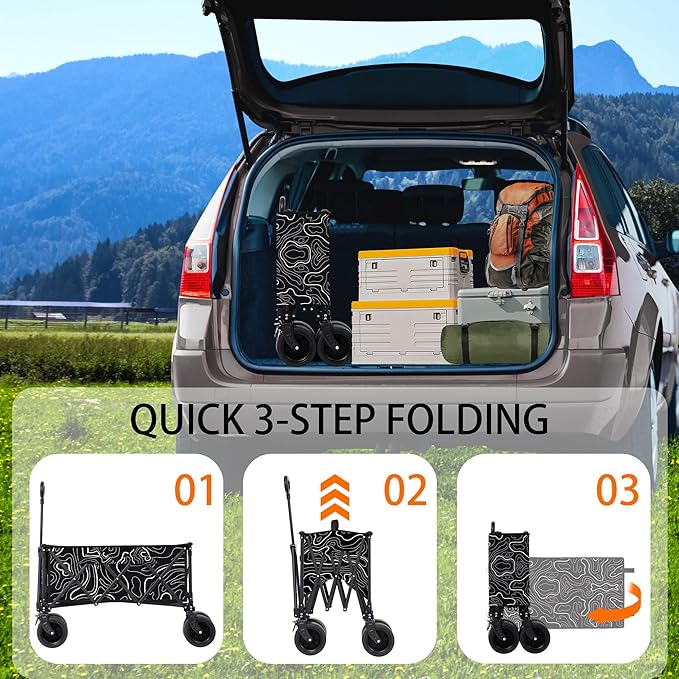 - Foldable & Collapsible for Easy Storage: Designed for convenience, the collapsible wagon folds compactly in seconds, fitting easily into car trunks or closets. A perfect folding wagon cart with wheels for people who need space-saving gear.