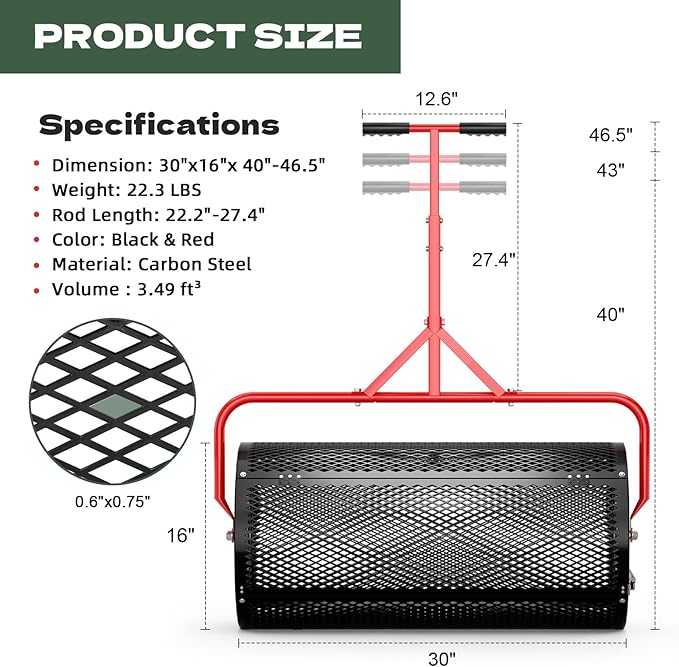 - [High-Efficiency Design - 3.49 Cubic Feet] This heavy-duty 3.49 cubic feet (โ200 lb) compost spreader delivers 400 sq ft of coverage per load, perfect for lawns up to ยผ acre. Its 30-inch wide roller ensures even distribution of peat moss, compost, or organic pellets, while the reinforced diamond-pattern mesh provides optimal filtration.