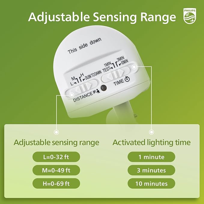 - HIGH-SENSITIVITY MOTION SENSOR - High-sensitivity passive infrared (PIR) motion sensor detects motion up to 69 ft away over a 180ยฐ angle; you can set light on time for 1, 3, or 10 mins.