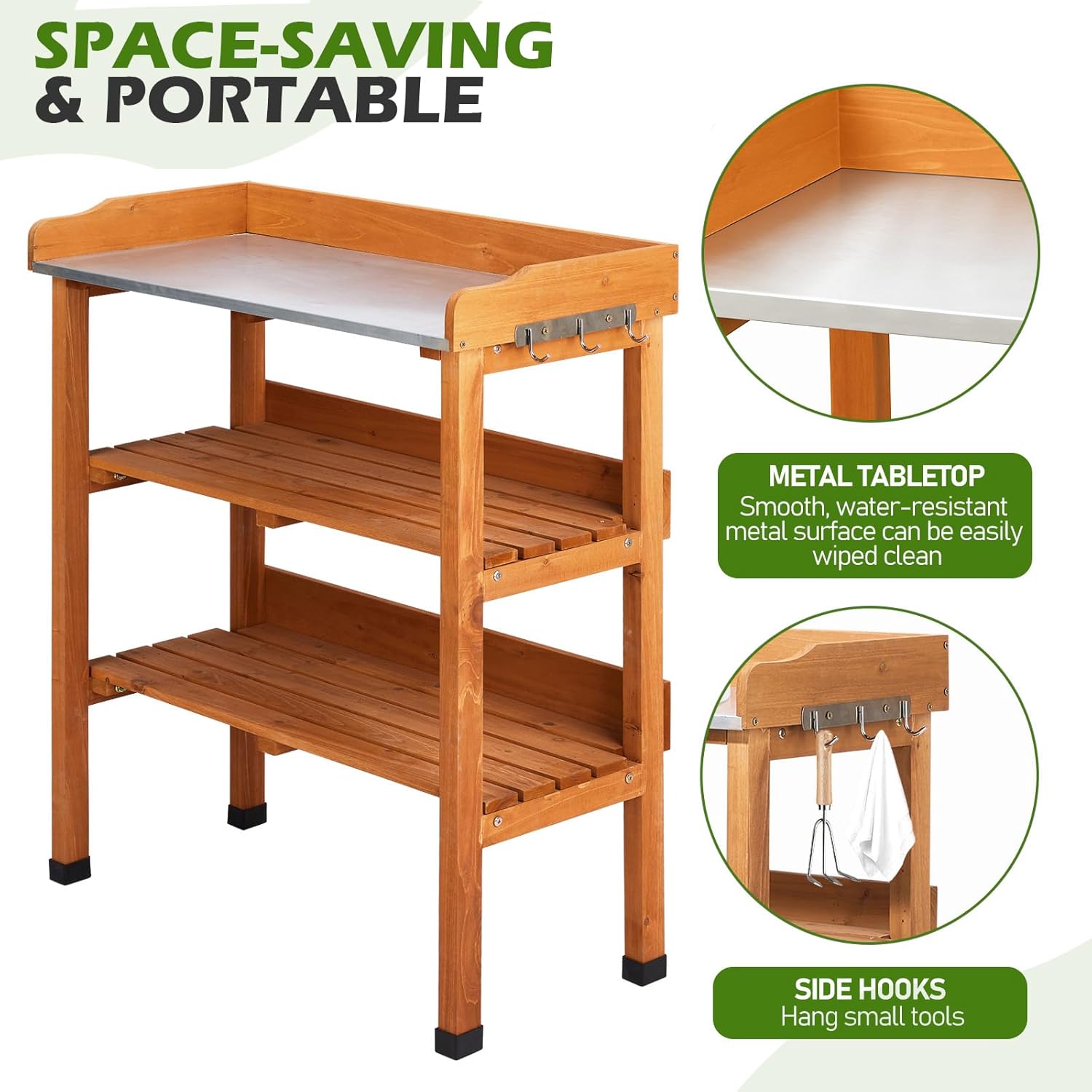 - 【Low-Maintenance Metal Top】Made with durable, smooth-coated metal that sheds water and stains. Simple to wipe down after gardening projects.