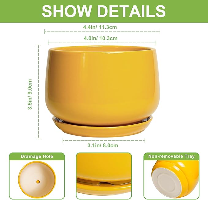 - Dimensions: The waist diameter of these ceramic plant pots is 4.4"/ 11.3cm, the external caliber is 4.0"/ 10.3cm, the height is 3.5"/ 9.0cm. This yellow planter is an ideal choice for growing succulent plants, cacti, aloe vera, orchids, snake plant, african violet, mint, rosemary, herbs, and other indoor & outdoor plants