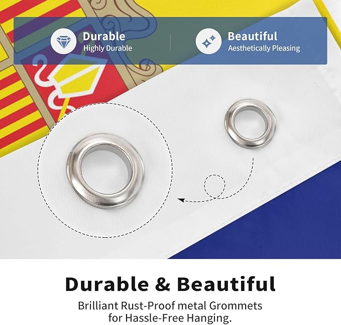- This 2x3 ft flag Andorran Flag banner is stitched double all around the edge and strengthened by two brass grommet to increase flag life and prevent fraying. Installation and disassembly are very convenient.