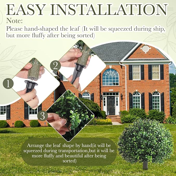 - Easy Installation: after assembly, you may need to manually adjust the leaves to achieve the desired shape; The design of the ground spike allows you to easily insert it into soil, grass or flowerpot without additional tools, making the installation simple and the placement flexible; If any leaves fall off during unpacking, just reattach them to the branches effortlessly