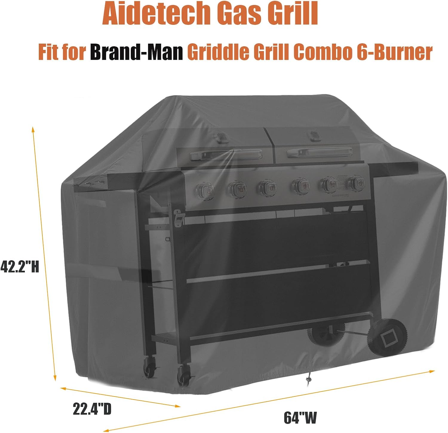 - Grill Cover Size: 22.4"D x 64"W x 42.2"H. Our propane grill cover compatible for Brand-Man griddle grill combo 6-burner. Also works with other brands grills of the same size. Please check your grill size