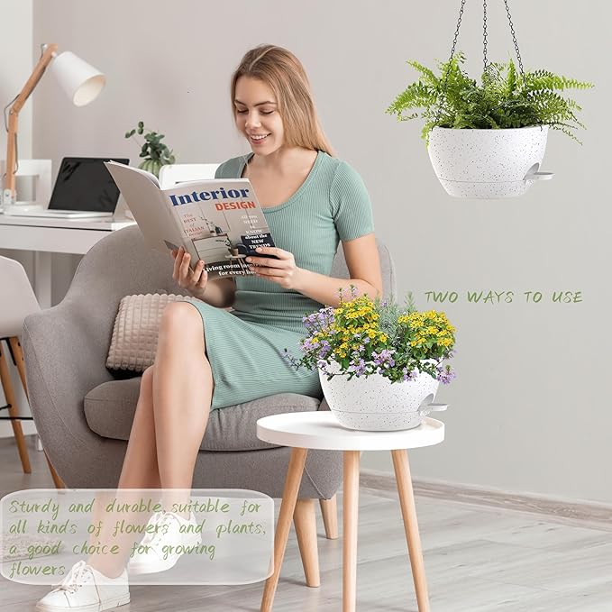 - 【Self-Watering Hanging Flower Pots with Removable Saucer】the appearance and structural design of the Hanging Pot prevents overwatering and acts as a water reservoir to promote Plant growth. It is suitable for a variety of Hanging Pot Plants, such as ivy, Herbs, Ferns, Philodendrons, Succulents, Flowers or other Plants