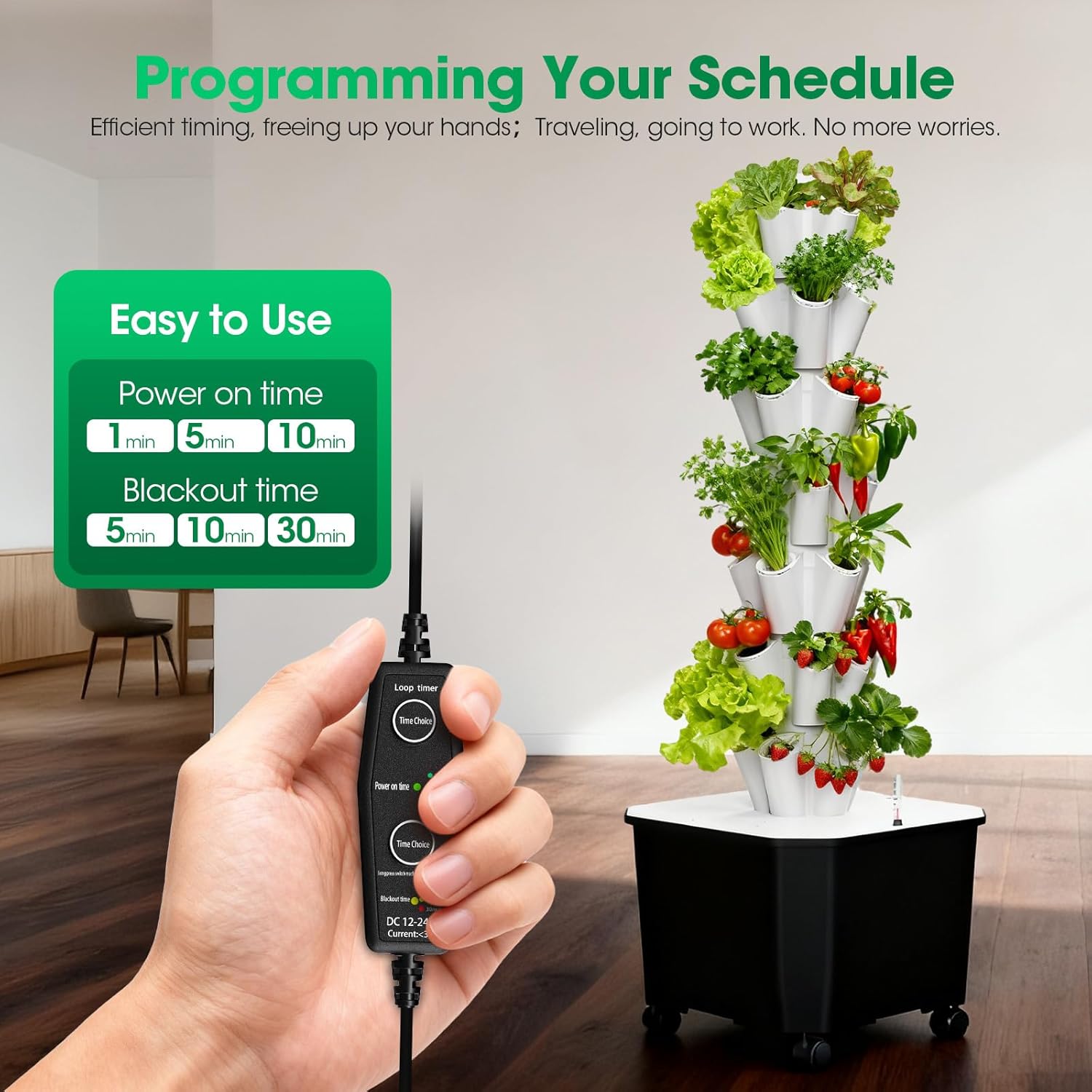- Powerful Water Circulation System:The hydroponic tower has a 25L bucket that lasts 5 - 7 weeks when fullBuilt-in 12V water pump ,The powerful pump propels water to a height of 46.5 inches, where the nutrient-rich water flow irrigates the planting baskets through gravity.24-hour continuous nutrient supply keeps plant roots moist at all times.