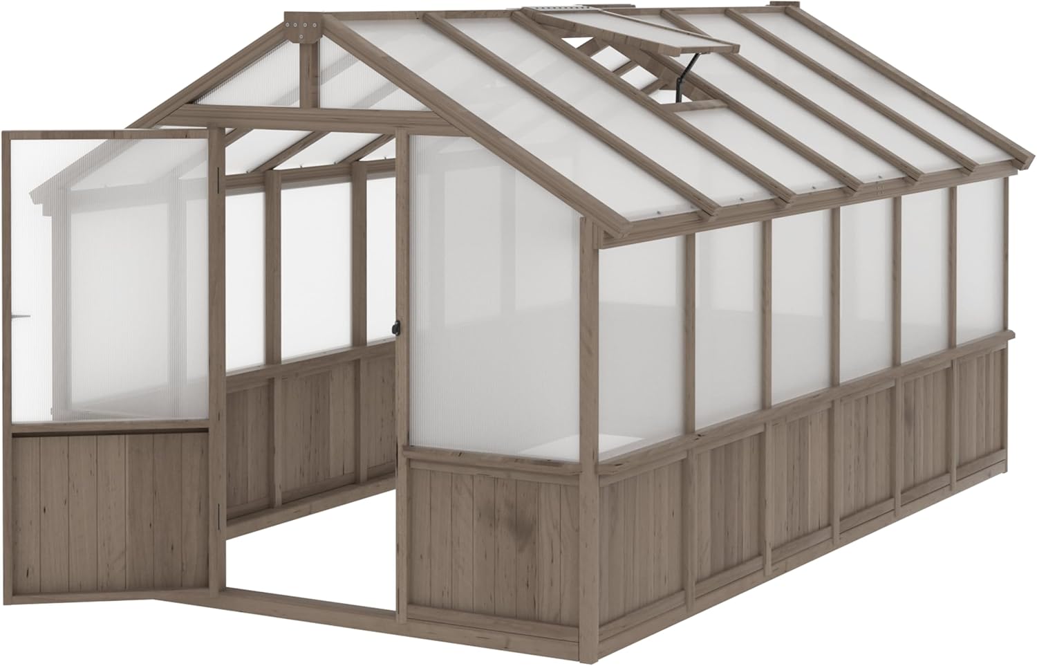 MUPATER 8' x 12' Outdoors Walk-in Greenhouse, Wood Greenhouse with Ventilated Window and Lockable Door, 6mm Polycarbonate Panels for UV Protection and Heat Insulation,Suitable for Patio, Backyard