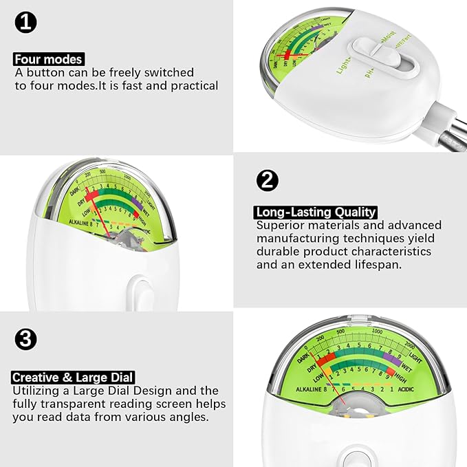 - All-in-One Soil Monitoring Tool: Designed to test soil moisture, pH level, nutrient content (Nutrient SHARED with "OFF" Button!) and sunlight intensity in one device, this soil tester helps optimize plant health by giving you clear insights into soil conditions. Ideal for smarter watering, fertilizing, and planting decisions