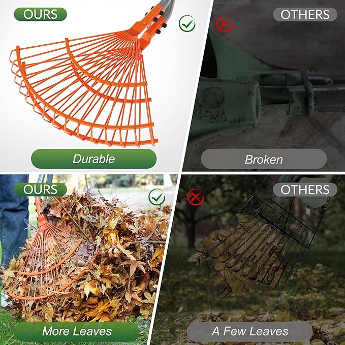 - More Leaves at A Time: Walensee Leaf Grabber Rake features steel wire claws that are far stronger and more durable.The open-weave design effortlessly gathers 2-3X more leaves per grab and the steel wire structure provides superior leaf collection capacity. Its ability to resist deformation ensures long-lasting performance, even with regular use. This robust steel claws design with comfortable, non-slip plastic grip makes it a highly dependable tool for both light and heavy-duty garden work.
