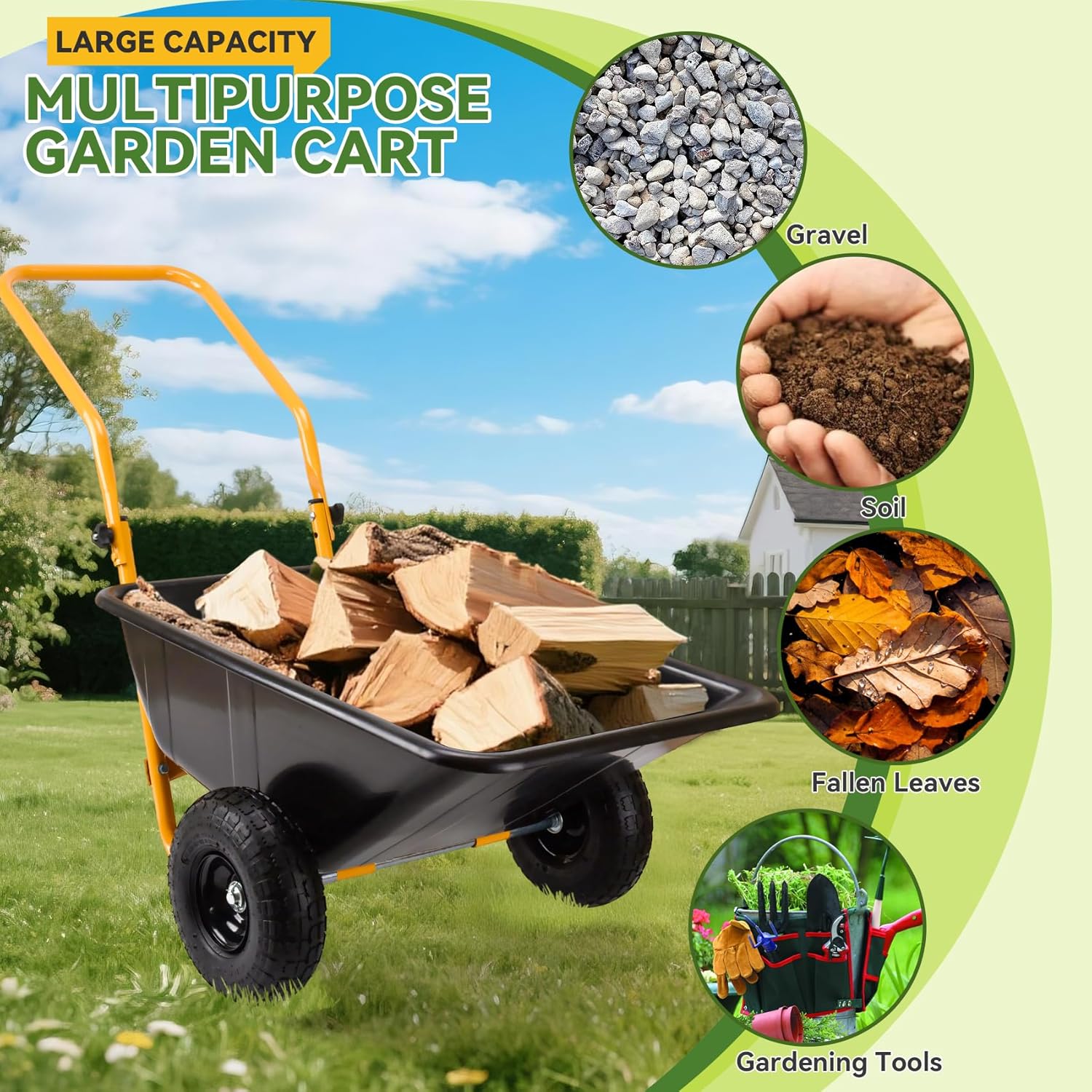 - High-Capacity 330 LBS Load Support:Built for heavy-duty tasks,this garden cart can handle up to 330 lbs (150 kg) of weight,making it suitable for construction debris,rocks,soil,or bulk gardening materials.The rustproof powder-coated steel frame and reinforced PP plastic bin resist cracking,bending,and corrosion,ensuring long-term durability in demanding conditions.