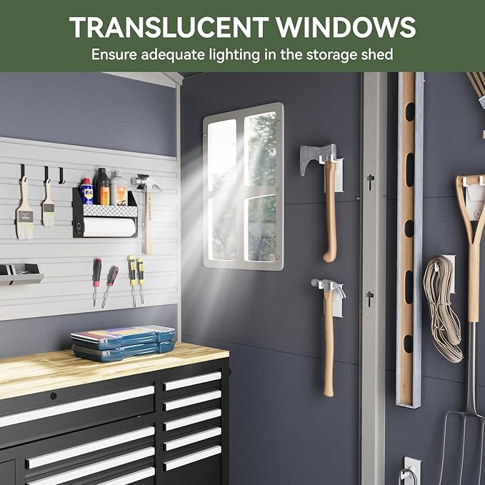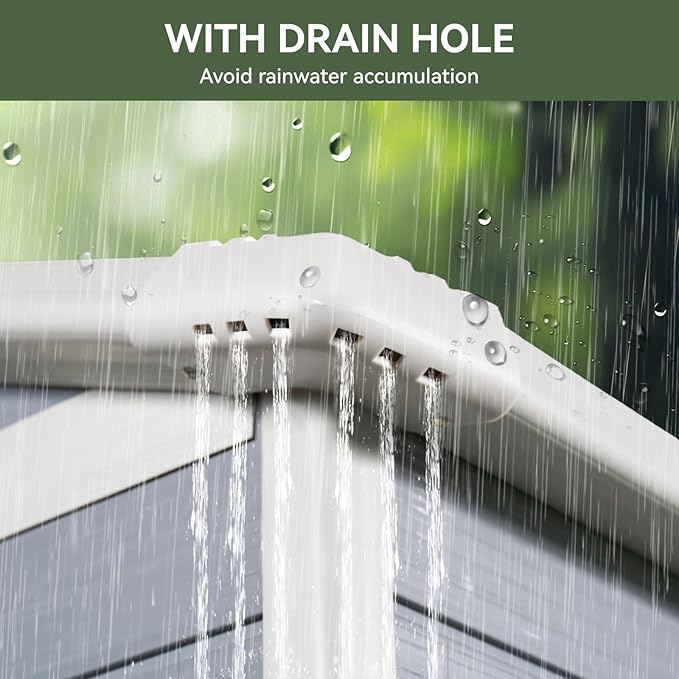 - Secure Storage System :The pitched roof construction effectively channels rainwater and snow to avoid water leakage from the top. Equipped with three-point anti-theft locking device access control, which not only prevents items from being stolen, but also blocks the entry of small wild animals.