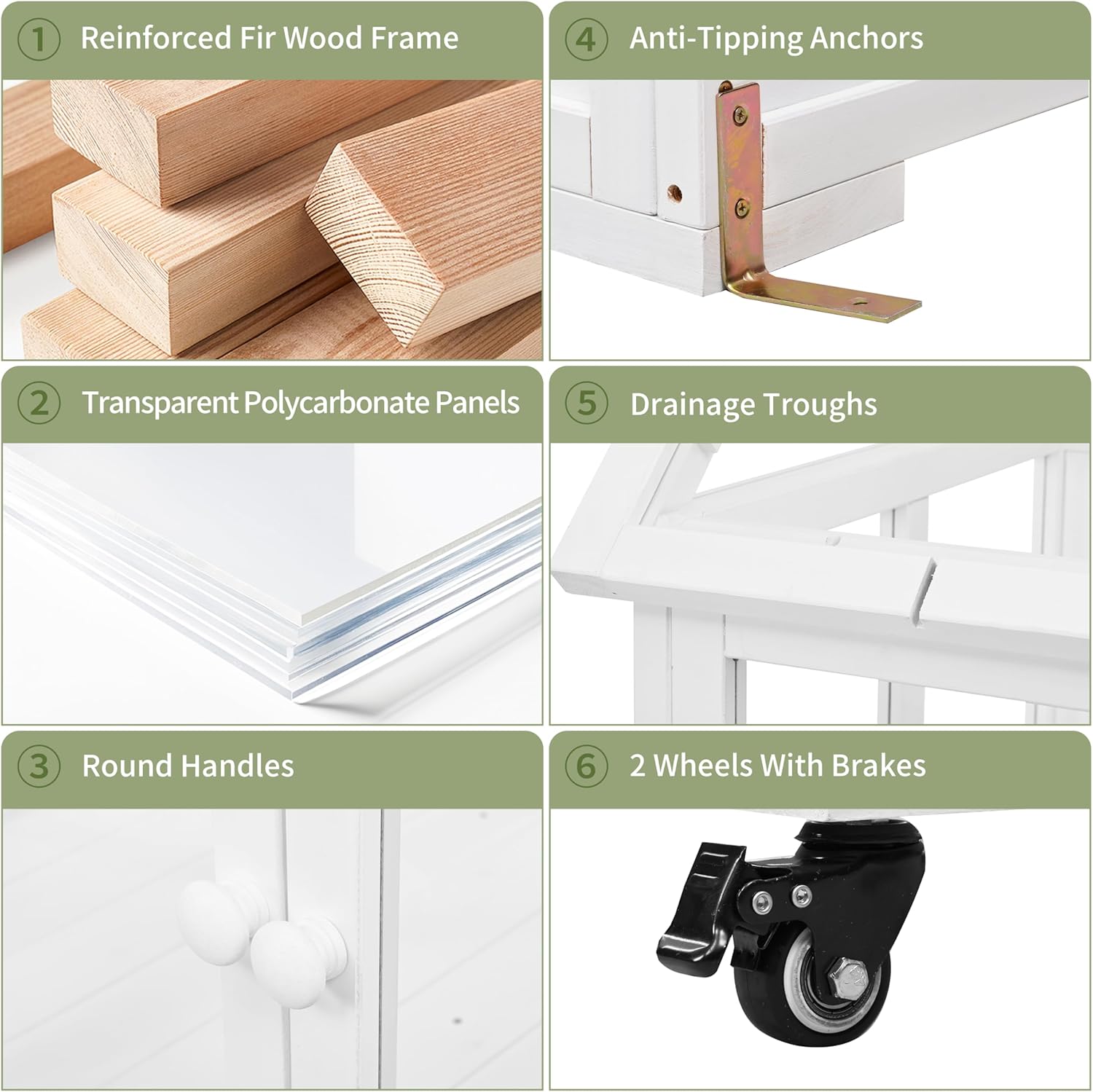 - Durable Fir Wood & Polycarbonate Panels – Built with 100% natural fir wood and UV-resistant polycarbonate panels that diffuse sunlight evenly, protecting plants from harsh rays while maintaining optimal growth conditions for seedlings, herbs, and winter crops.