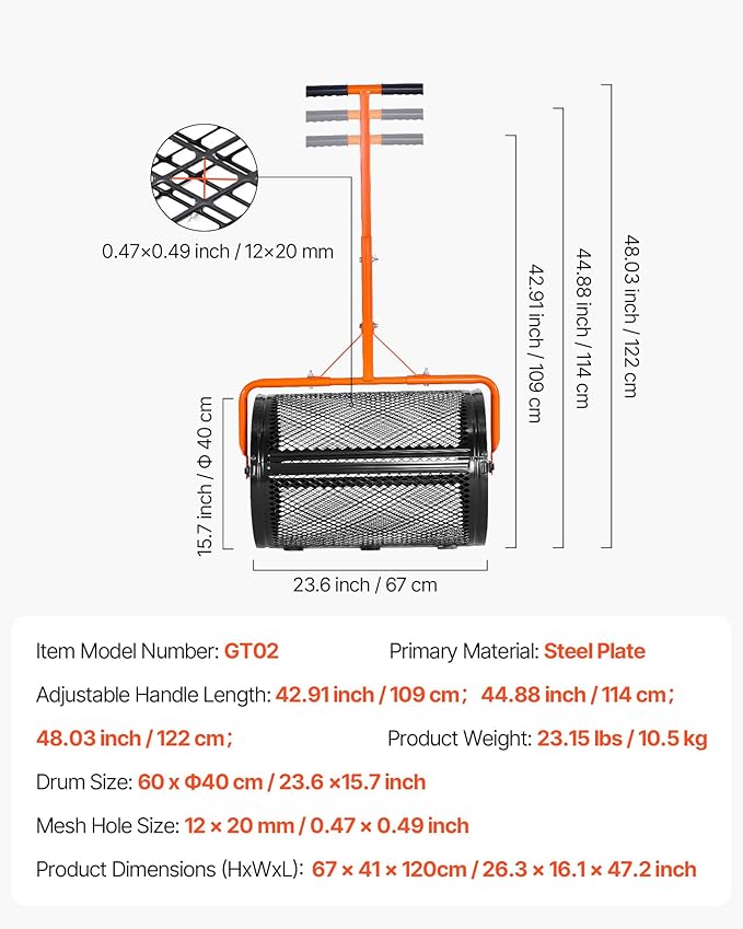 - Durable and Sturdy: Built with an integrated steel drum and precision-cutting technology, this compost spreader is solid and sleek. The 25 mm (0.98 inch) thick handle is powder-coated for enhanced durability and rust resistance. Its large size (60 x Φ40 cm) ensures higher spreading efficiency for lawns and farmlands.