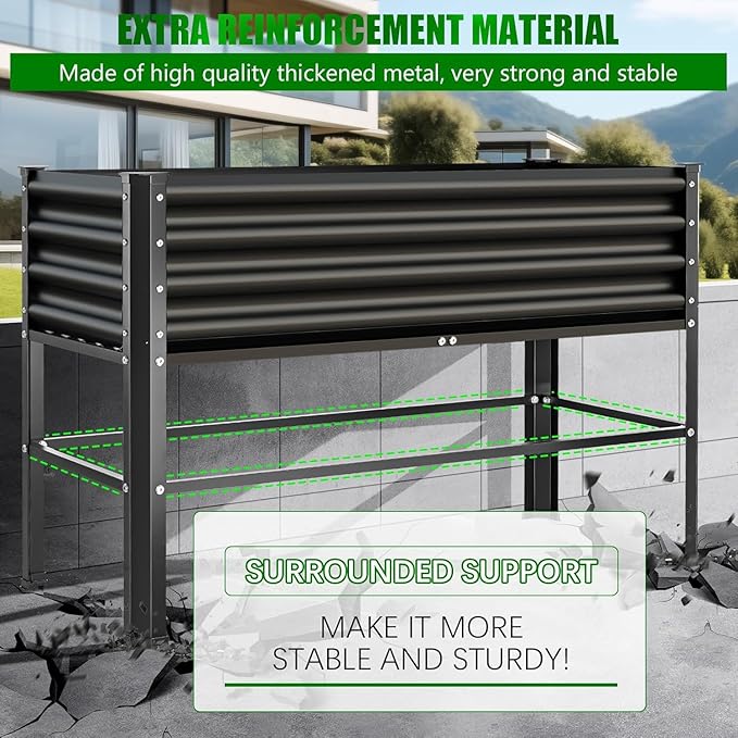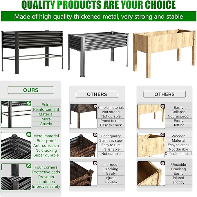 - 【Distinctive Design】-Outdoor elevated garden beds, our custom design style features galvanized sheet metal on the top, a stainless steel frame on the middle base, and the lower four corners are made of heavy-duty steel with a black powder-coated finish,This combination exceeds the lifespan of wooden products and ensures excellent rust resistance to keep the garden bed in the best condition for a long time.